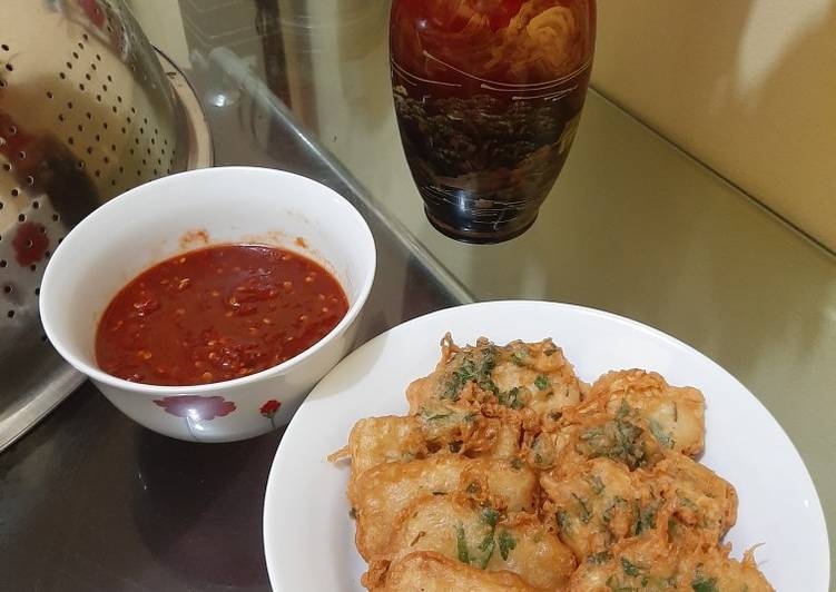 - Buat adonan tepung siap saji, masukkan air lalu tambahkan daun seledri.