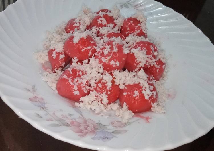 - Jika sudah kalis ambil sedikit-sedikit adonan dan masukan sedikit-sedikit gula Jawa yang disisir lalu dibulat-bulat.