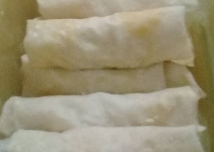 - Siapkan lembaran kulit lumpia. kemudian isi satu persatu dan gulung. goreng secukupnya dan yang lain bisa untuk cadangan. masukkan freezer. goreng saat dibutuhkan. bertahan 4 hari dalam freezer. Bisa jadi 20 potong. ditambahkan daun bawang lebih lezat..