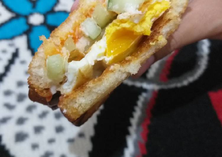 - Siapkan 1 lembar roti yg sdh dipanggang, tata diatasnya berisi tomat, timun, keju, telur dan jangan lupa beri saos dan mayonesnya..