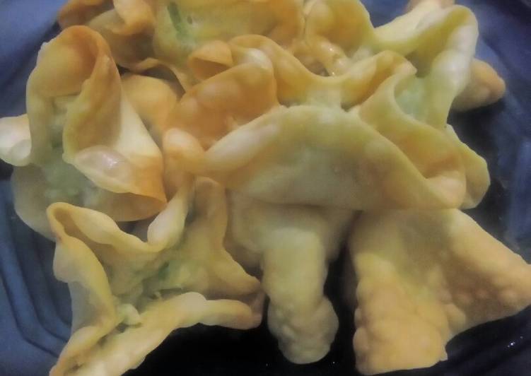 - Panaskan minyak, isi kulit pangsit dengan seujung garpu adonan (nanti ngembang koq bukannya pelit..) goreng ke dalam minyak yang sudah panas dengan api sedang cenderung kecil biar isinya ikut matang.