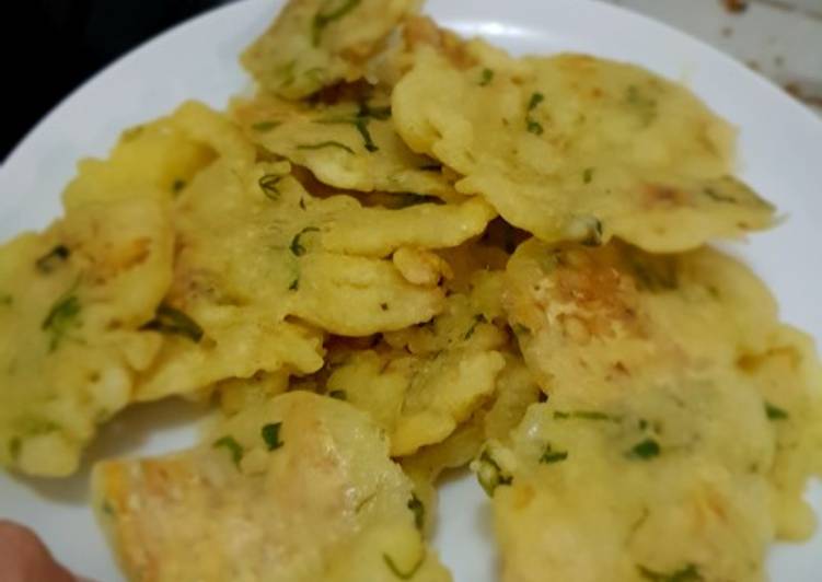- Campurkan terigu irisan daun bawang garam merica dan kaldu ayam.. tuangkan air pelan2 jangan terlalu kental.. buat aga encer.